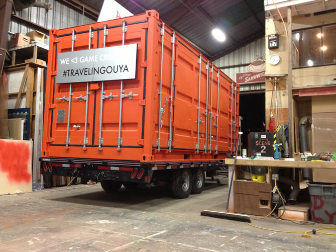 We converted a 20 foot shipping container to create a trailer-based plug-and-play unit that can be opened and set up by two people within an hour. One Hat One Hand designed, fabricated, and installed the platform inside a city-block long event tent, along with gaming consoles and custom pedestals. We designed it modularly to be taken apart and reassembled in case of future events and work as a mobile unit for promotional tours.