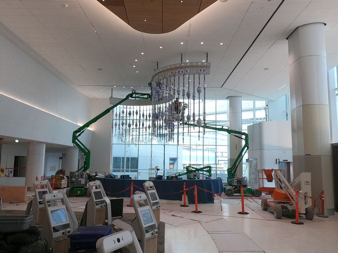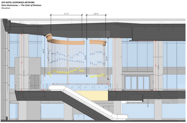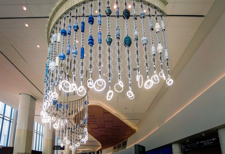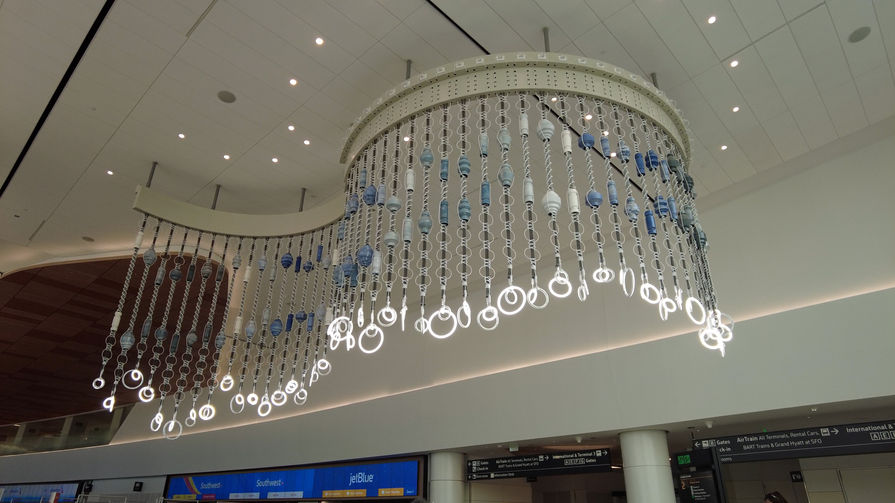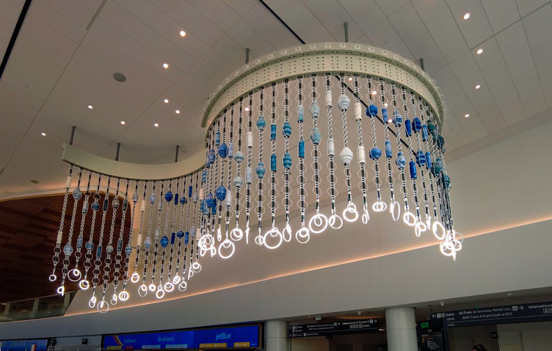 "The Color of Horizons" is a site-specific, suspended light sculpture by Bay Area artist Dana Hemenway, installed at San Francisco International Airport. Dana applies craft techniques – such as weaving and macramé – to utilitarian objects, effectively transforming the object’s value beyond its functionality.