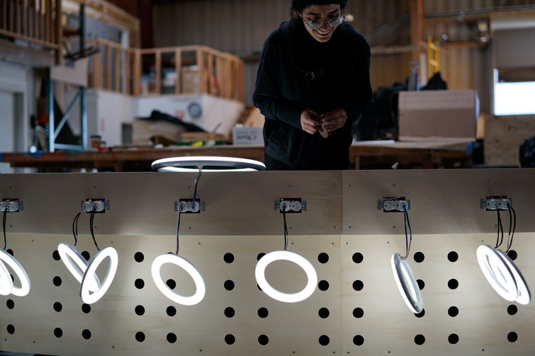 The project includes materials like rope, extension cords, circline bulbs, and ceramics. For this sculpture, we needed to ensure not only that the lighting functioned within the art, but that the enclosure that housed the sculpture met the building standards of the airport. We started with a series of sketches and 3D prints to test the connection transition between the extension cords to the bulbs; then worked into small-scale prototypes before moving to full-scale mockups.