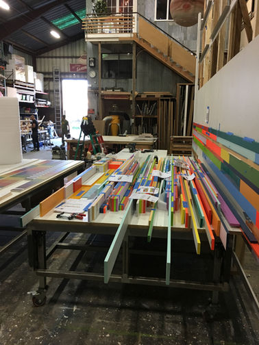 After building a grid for the color layout, we systemized the build out of panels in readily available material in 3 common widths. From there, we planned how to prefabricate, disassemble and reassemble for the airport. We knew installation at SFO would be complex, so we made a mockup of the airport wall in our studio to simulate the onsite conditions. Airport requirements meant the piece had to be fire and seismic rated; stamped by an engineer; and meet archival standards.