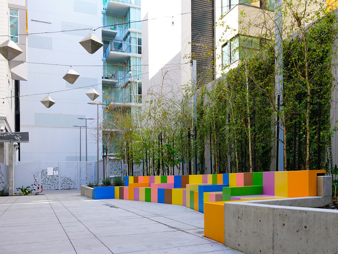 Leveraging our deep materiality expertise, our in-house design and fabrication team tackled site-specific challenges head-on, crafting the benches from the finest stainless steel with precision welding that ensured seamless straight lines, clean seams, and sharp corner details. We applied a highly advanced, durable coating engineered to preserve the vibrancy and integrity of the color against weather and wear.